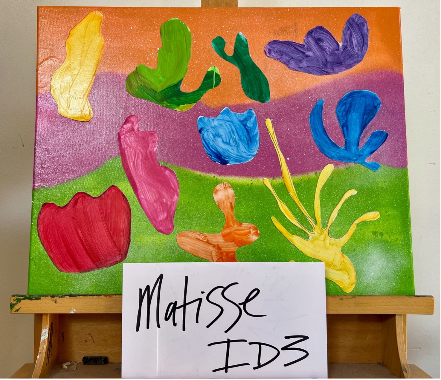 In ID3, students learned about Henri Matisse and his colorful paper cut-out artworks, created late in his career. Inspired by Matisse’s technique of “drawing with scissors,” students cut shapes from brightly colored paper and arranged them into their own playful compositions, exploring color, shape, and balance.