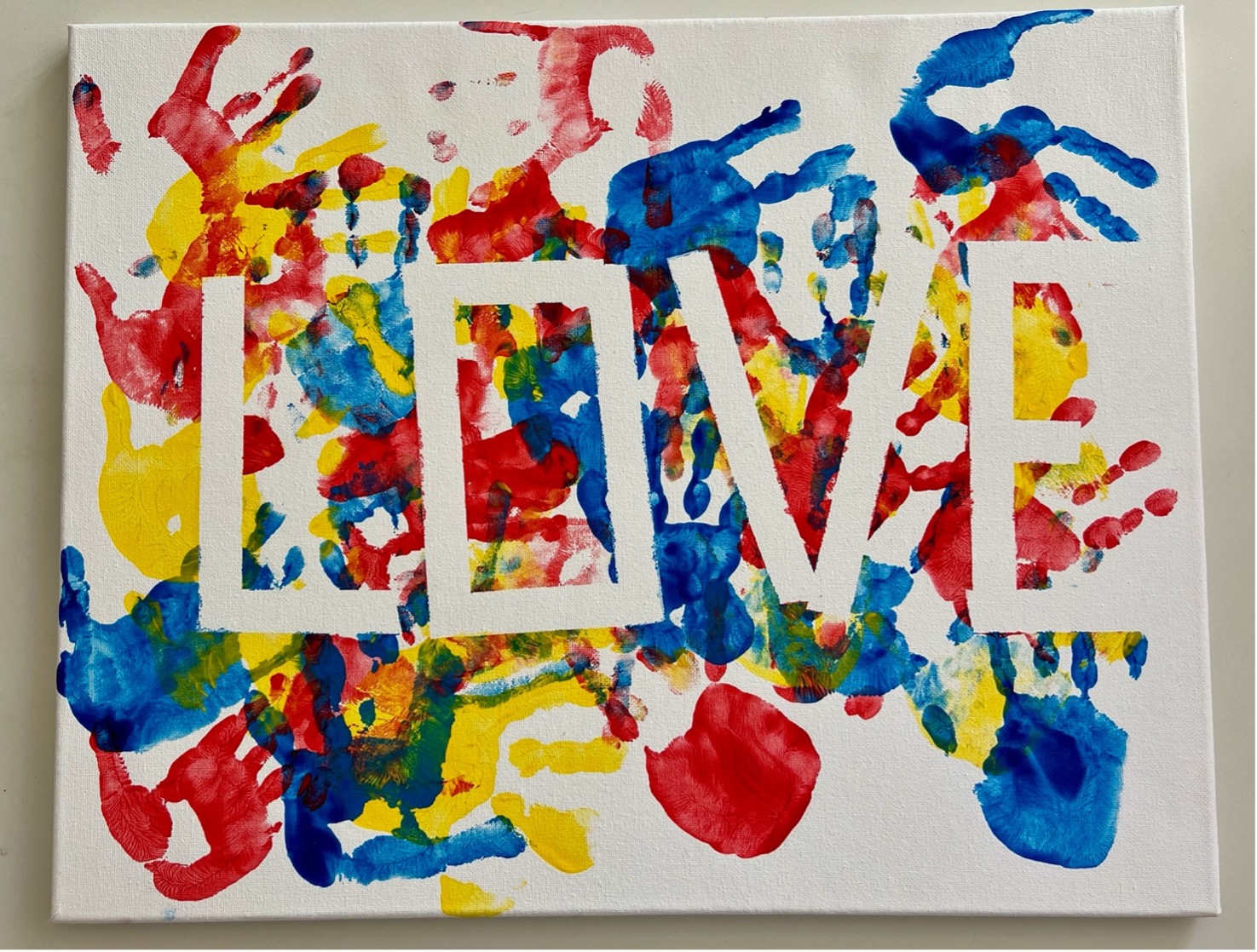 A classroom classic: sweet little handprints in primary Mondriaan colours. A joyful, handmade piece of art!
