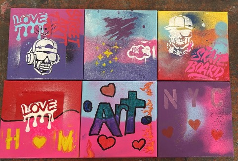 Students in NA6 explored street art techniques by creating artworks with spray paint and stencils. They designed and cut their own stencil shapes, then layered spray paint to build bold images and patterns. Through this process, students experimented with contrast, shape, and layering, inspired by the visual language of urban street art.